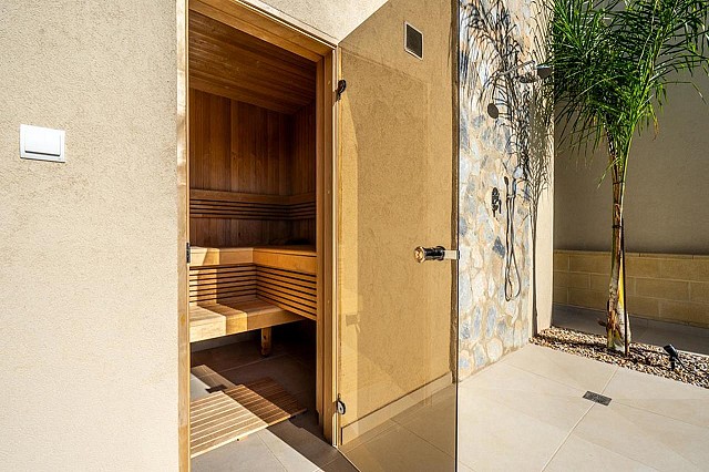 Durch die begehrte Südausrichtung ist die Villa den ganzen Tag über mit natürlichem Licht erfüllt. Das Herzstück des Hauses ist ein geräumiger, offener Küchen- und Wohnbereich, der durch große Glasschiebetüren nahtlos mit dem Außenbereich verbunden ist. Die moderne Küche ist komplett ausgestattet und verfügt über einen Weinkühler, zwei Kühlschränke und eine begehbare Speisekammer/Waschküche.