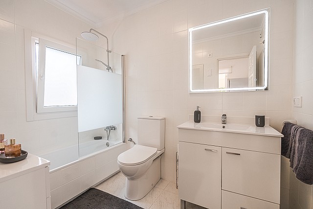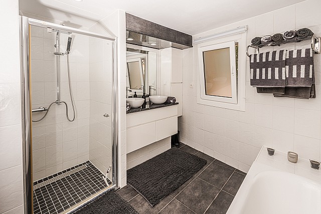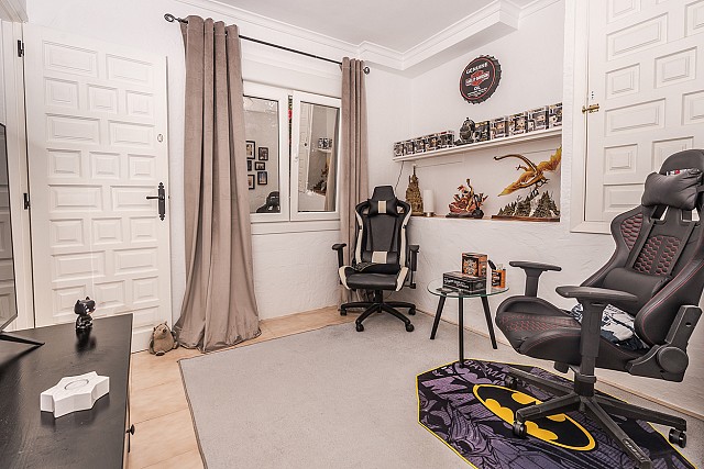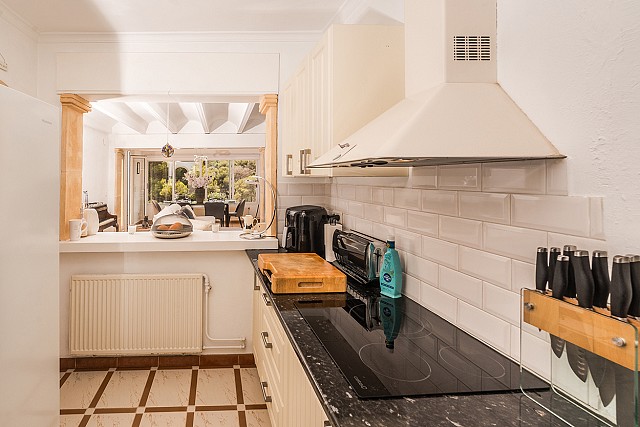 Die Pforte öffnet sich zu einem schönen und sehr privaten, pflegeleichten Innenhof mit einheimischen Bäumen und Pflanzen. Von hier gelangt man in ein helles Wohnzimmer mit großen Glasfenstern und einem Kaminofen. Hier gibt es auch eine offene und voll ausgestattete Küche, die mit einem Esszimmer verbunden ist. Das Esszimmer hat Terrassentüren zur Poolterrasse, die im Sommer der perfekte Ort ist, um Familienmahlzeiten zu genießen. Durch einen Flur gelangt man zu zwei großen Schlafzimmern und einem kompletten Badezimmer mit Dusche. Das zweite Schlafzimmer war früher ein Büro und verfügt über einen Kaminofen. Von hier aus führt eine Treppe zum Hauptschlafzimmer, das ein eigenes Bad hat.
